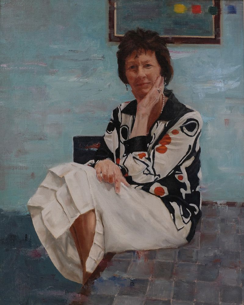 Brushwork moves from crisp edges in the face and hands to looser, blocky strokes in the background and tiled floor. Light from the left models cheek, knuckles, and the layered folds of the skirt, while softer shadows dissolve the far shoulder and seat. The balance of pattern and calm color creates an intimate, contemporary portrait that feels relaxed yet attentive.