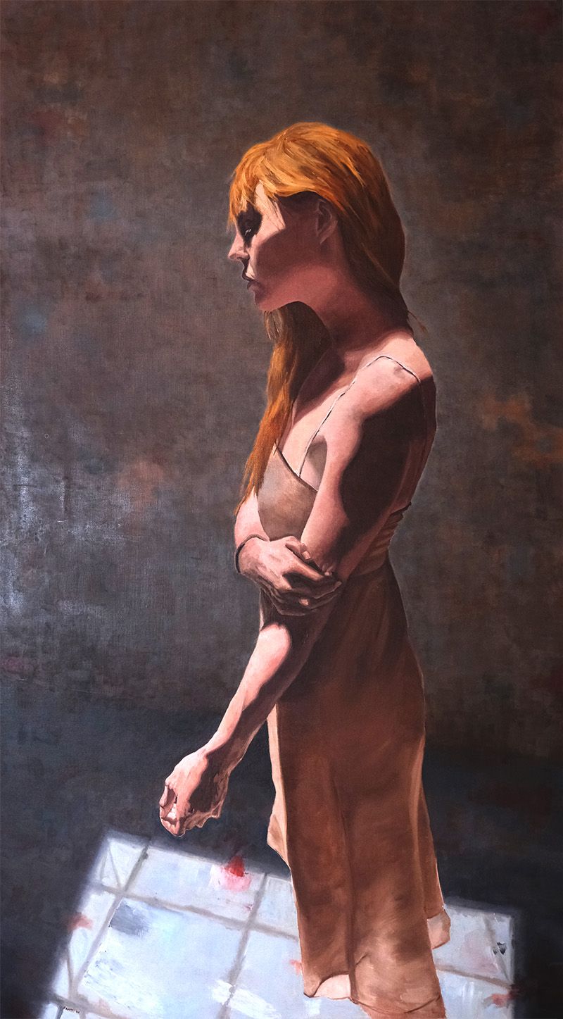 Brushwork moves from thin, velvety passages in the shadowed wall to firmer modeling along the lit planes of skin and the translucent slip. Warm copper in the hair and dress answers the cool ground, and edges shift between sharp and lost so the figure seems to emerge from the gloom. The spotlighted tile, speckled with small stains, anchors the scene and adds a quiet note of unease.