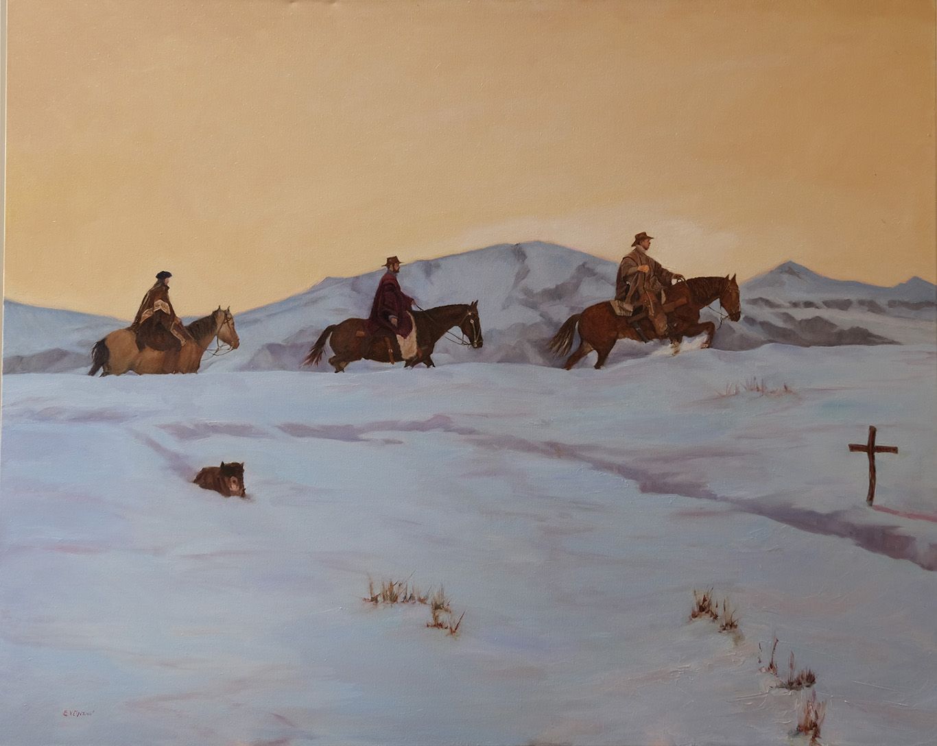 The final piece in my series of three snow day paintings captures the moment when the sky transformed to gold, as the setting sun reflected off distant clouds and mountains. Exhaustion weighs on everyone—shoulders slump, energy wanes. In a quietly surreal touch, I placed a cross on the far right, bearing words as a hidden message for the observant viewer.