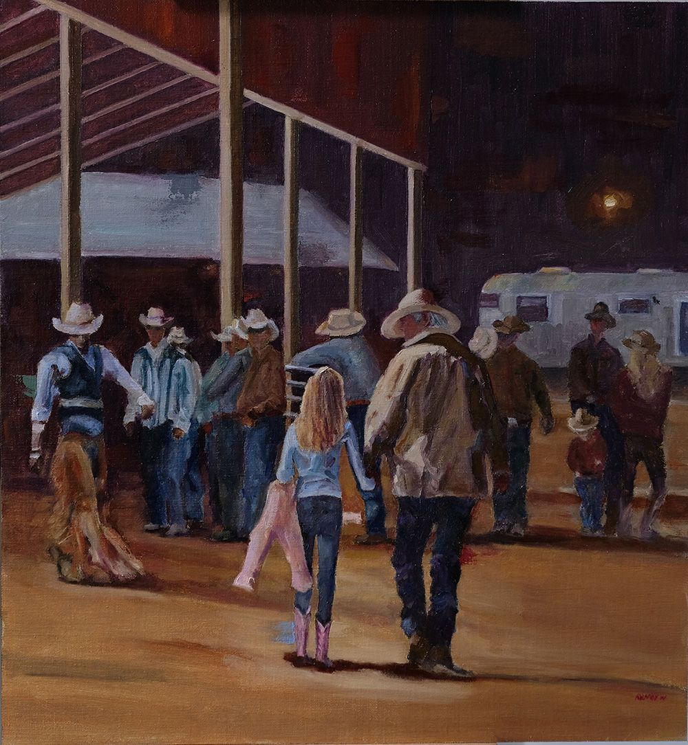 Under stadium lights at night, figures in hats and denim gather outside a barnlike structure with bright vertical posts and a diagonal roofline. At center-back, a young girl in pink boots walks hand-in-hand with an older cowboy toward the crowd; their long shadows stretch across the dusty ground, anchoring the composition and creating a gentle, narrative pull into the scene. To the left, riders in fringed chaps and work coats converse near the open shed, while to the right a trailer and scattered onlookers suggest the wider rodeo grounds.