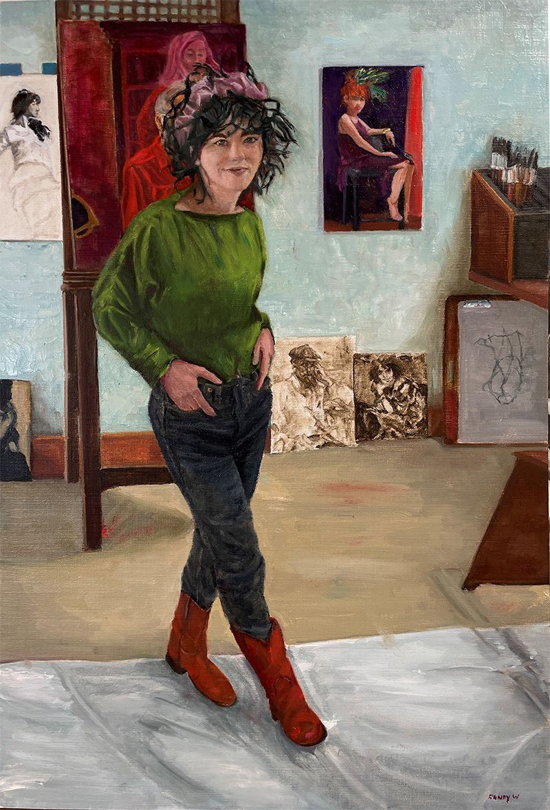 A young woman stands casually in an artist’s studio, hands tucked into dark jeans, weight resting on one hip. Her green sweater and tousled dark hair crowned with a pink headband set a lively focal point against cool blue walls. Red boots step onto a pale drop cloth that cuts across the foreground, while her relaxed smile and three-quarter pose invite an easy, conversational mood.