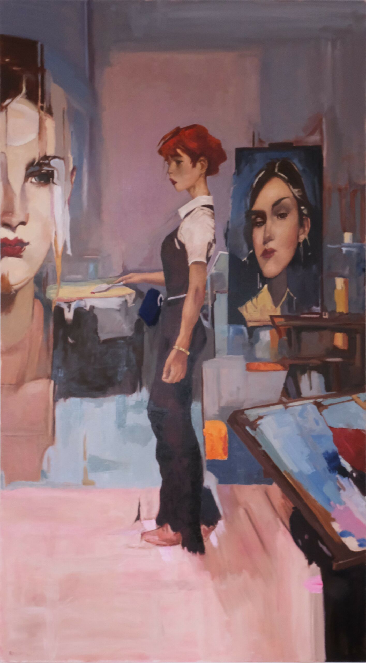 A red-haired painter stands in profile at the center of a tall, airy studio, dressed in a white shirt and dark apron, one hand relaxed at her side and the other near a work table. Around her, large portraits lean and hang: on the left a monumental face with dripping highlights presses into the scene, while on the right a cool blue panel shows a poised woman glancing out. Mauves, lilacs, and slate blues shape the room, with warm notes of ochre and coral slipping in across tables and canvases. The figure’s calm posture and precise silhouette create a still axis amid the bustle of unfinished work.