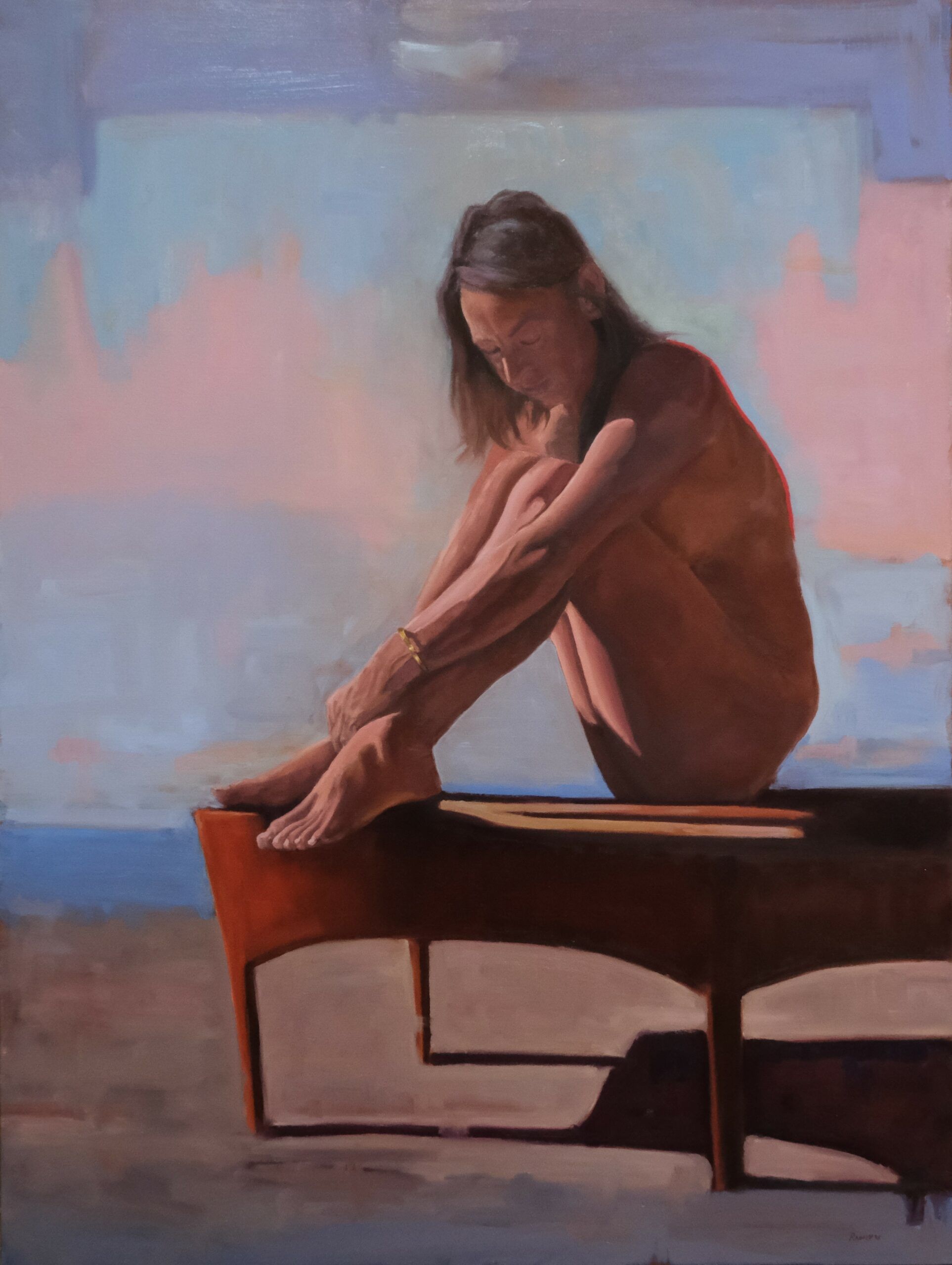 Behind the figure, the sky reads as a soft field of pastel blues and pinks with blocky, abstract edges that frame the body without competing for attention. The warm terracotta of the bench and sunlit skin plays against the cool sea horizon. Brushwork is measured and assured, crisp along lit limbs and looser in the atmospheric background, producing a contemplative, coastal calm.