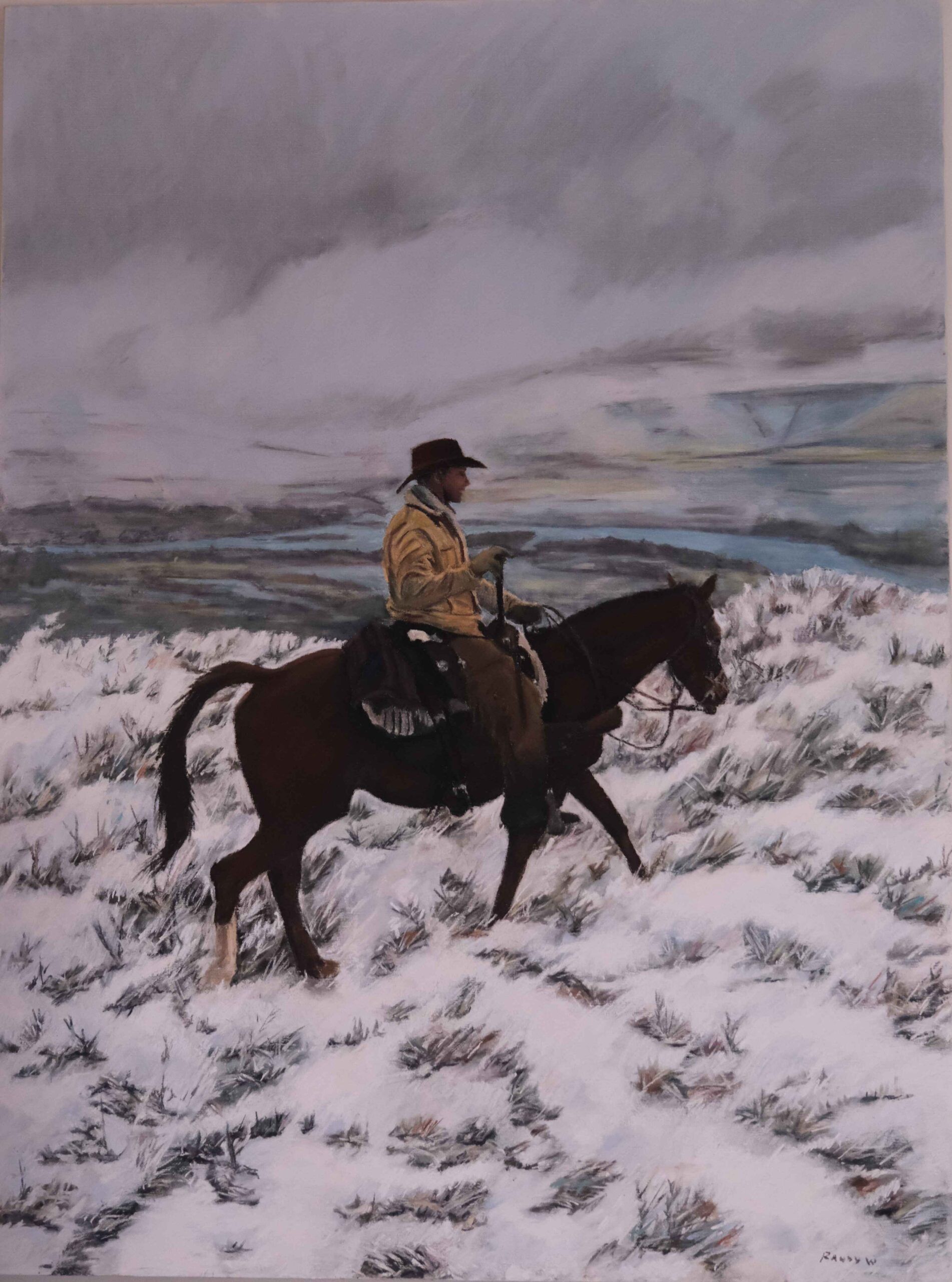 The Collon Cura River flows in the background, while Lucas displays that natural ease in the saddle that makes him such a compelling subject. I believe this painting successfully captures his quiet confidence on horseback. The piece is framed with conservation glass.