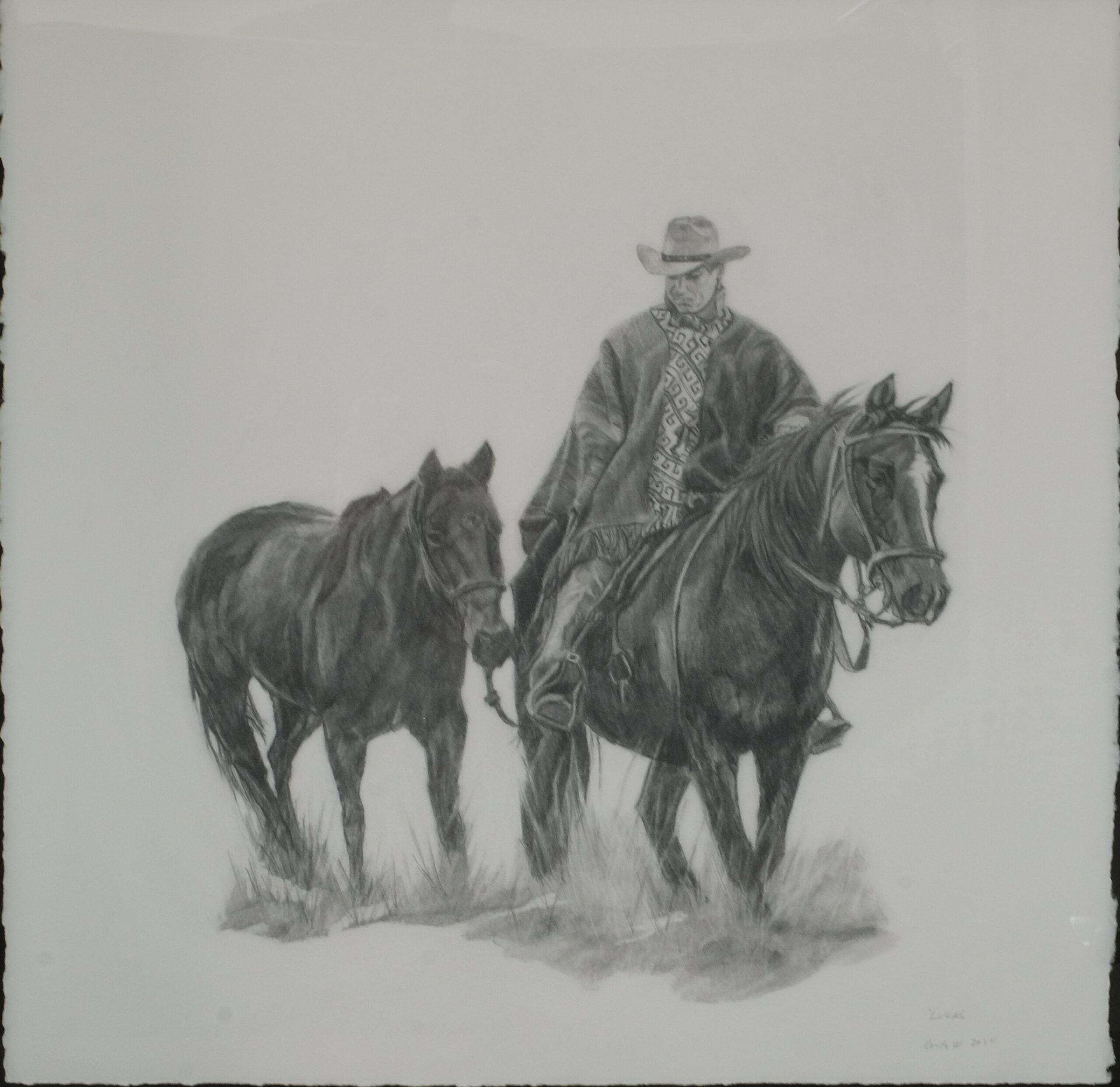 A gaucho rides while leading a second horse across open ground, drawn in nuanced graphite with clear edges, soft values, and generous negative space.