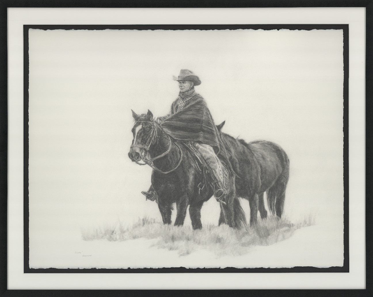 A rider in a brimmed hat and poncho sits upright on a dark horse, facing slightly left. A second horse stands just behind and to the right, its head level with the rider’s knee, so the three forms read as a compact group set low in a wide field of white. Sparse grasses and a light ground shadow anchor the cluster while expansive negative space suggests open range and quiet air.