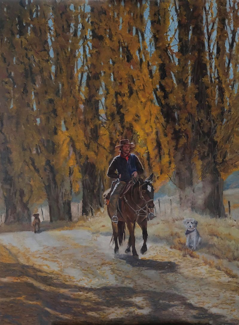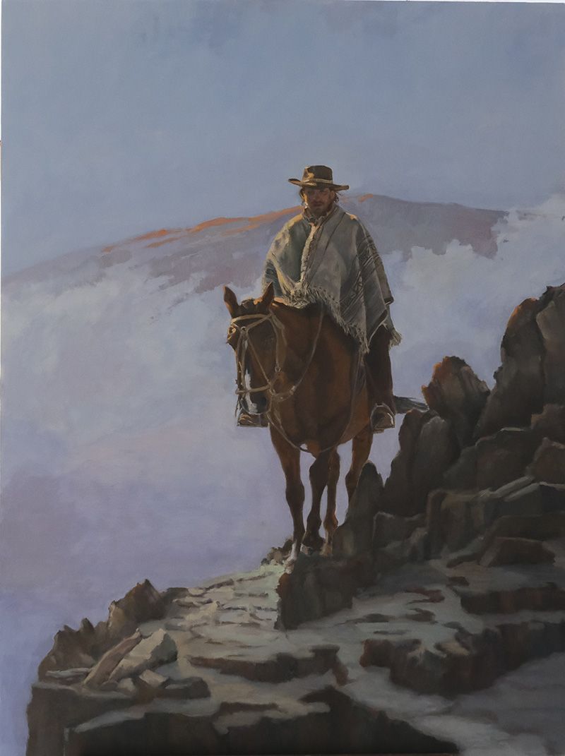 The horse carefully makes its way along a narrow cliffside trail, the precipice dropping steeply away beneath its hooves. Both horse and rider show the weight of exhaustion, yet the rider’s gaze remains fixed ahead, alert to unseen dangers. The scene is bathed in an unusual light: the atmosphere feels nocturnal, yet the raking sun illuminates the upper body of the rider and horse, creating a stark, dramatic contrast.
