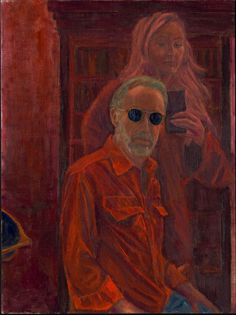 A saturated red field unifies an intimate interior: a seated figure in a work shirt turns three-quarter toward the viewer, gray hair and beard catching cool highlights, round blue-tinted glasses giving the face a guarded calm. Behind and slightly above, a second figure holds a phone as if framing the scene; both are set against a dark bookcase whose verticals and rectangles stabilize the composition while deep maroons and oxides push the space back.