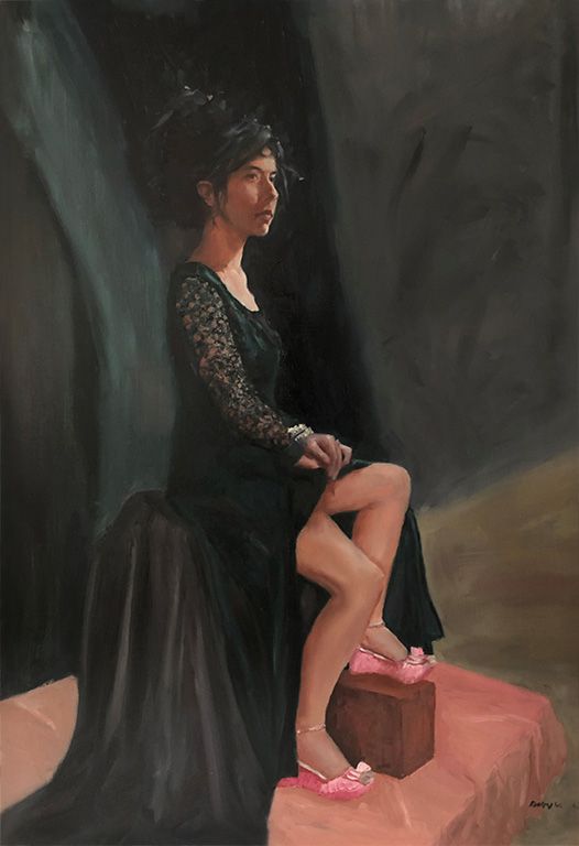 Warm light models cheek, collarbone, and the bent knee, leaving the far side in cool half-shadow. At the base of the composition, a pair of bright pink shoes rests on a small wooden block and the rose-colored drape—an unexpected pop that counters the subdued blacks and grays. The controlled edges and measured values create a calm, classical mood, while the playful footwear adds a contemporary note of personality.