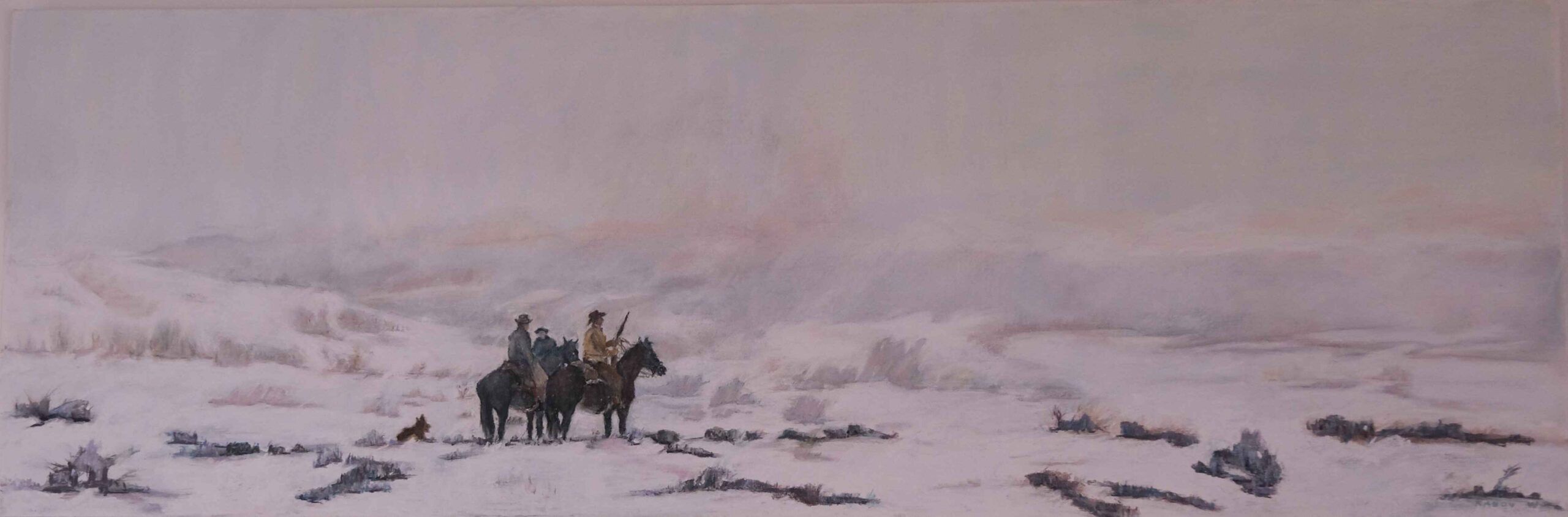The pale tones of snow and sky blur the horizon until it nearly vanishes, giving the scene an almost surreal quality. Sparse brush breaks through the snow, reminding us of the rugged land beneath the storm. Painted in pastel on linen, the work balances atmosphere with character, conveying both the vastness of Patagonia and the resilience of the riders who move across it.