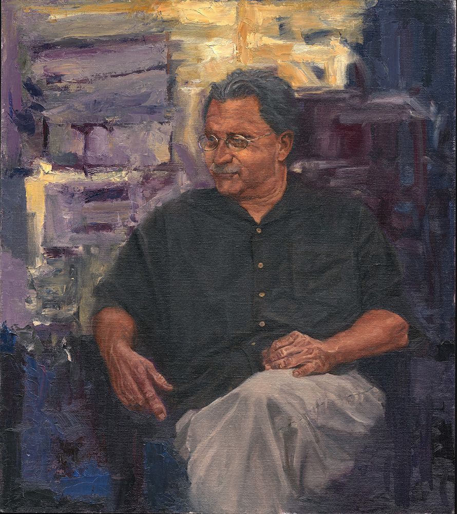 A seated figure in a dark short-sleeve shirt leans slightly back, head turned to with a relaxed, observant expression. Round spectacles catch small notes of light, and the warm planes of the face contrast with cool gray hair. The hands—one loosely gesturing, the other resting near the lap—animate the pose, while pale trousers fold into soft, weighty shapes that anchor the lower half of the canvas.